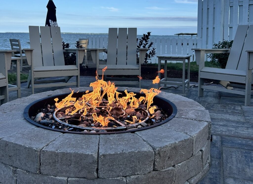 Kick back and have some fun with lawn games like cornhole, giant Jenga, and an oversized Adirondack chair from Shores & Islands. Grab a spot at our lakeside tables, complete with umbrellas for some shade while you chill and take in the view. And just added this past June — a gorgeous stone fire pit with seating, perfect for cozy nights overlooking the lake.