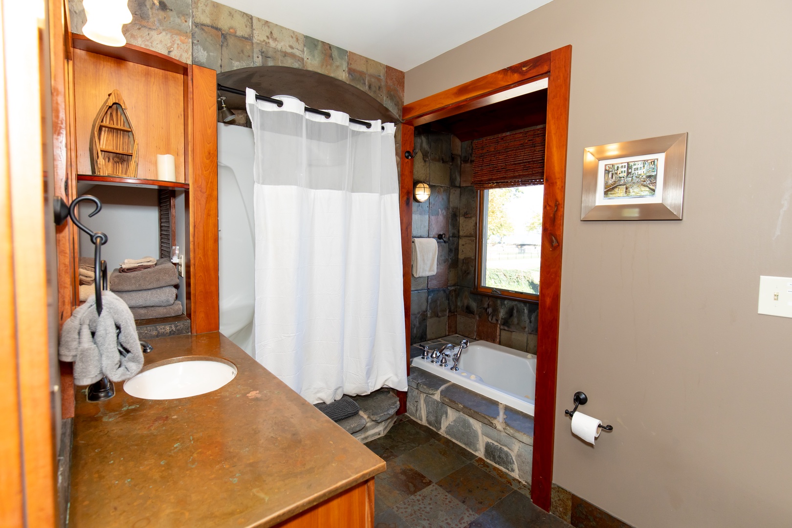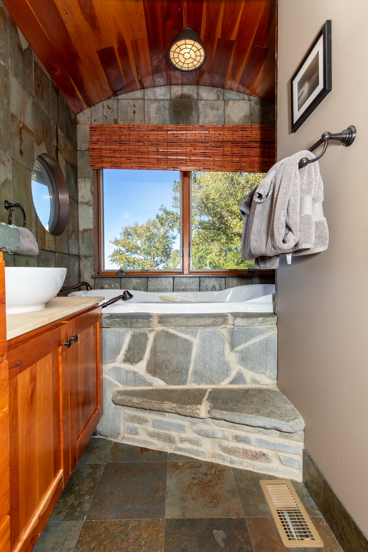 - Primary King Suite: Jacuzzi tub, fireplace, laundry, deck & mini-fridge