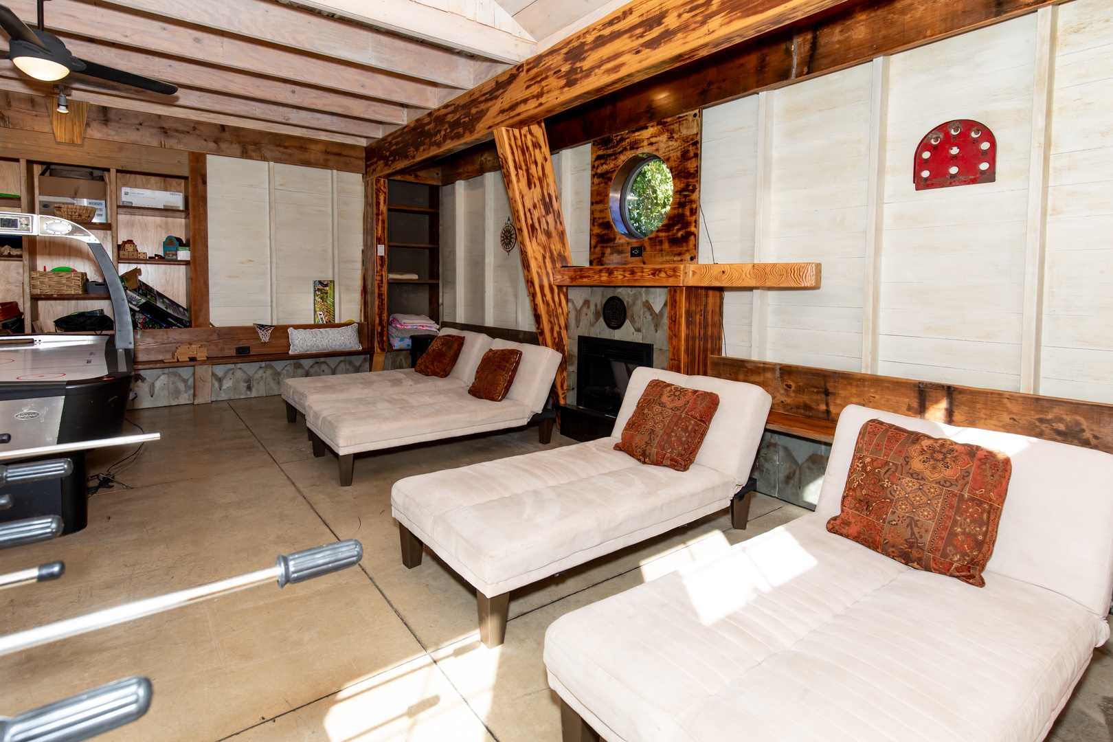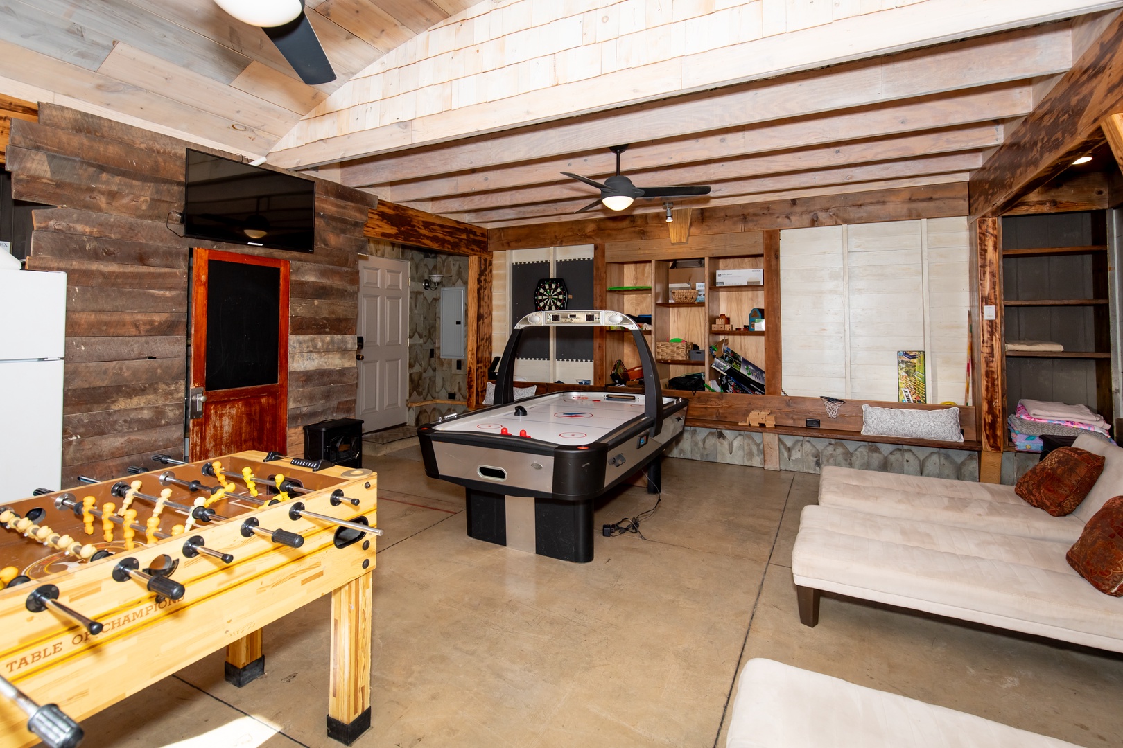 - Game Room/7th Bedroom: Air hockey, darts, 4 twin lounge beds + half bath (seasonal)
