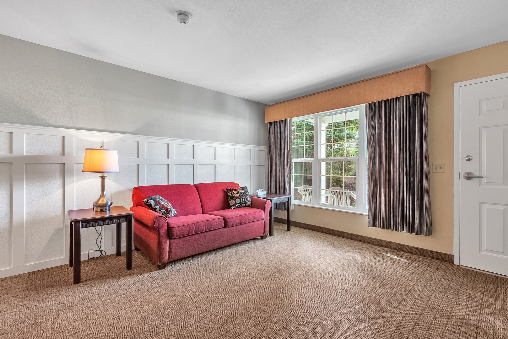 The Glacier Suite is divided by the bathroom into a living room and sleeping area. The sleeping area is furnished with a king size bed and the living area has a full sleep sofa for that extra guest or the kids. The suite is equipped with all the amenities for an extended stay including a small refrigerator and microwave.