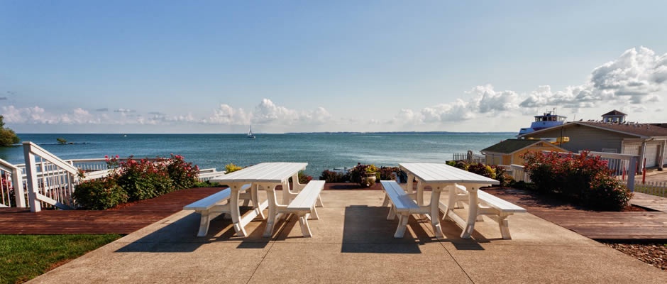 Each suite features mini kitchen appliances, flat-screen TVs, and high-speed internet access. A large swimming pool with therapeutic seating areas and an outdoor hot tub sits in our beautifully landscaped courtyard. Across the street, the resort offers a three-tiered deck with seating to enjoy the views of Lake Erie, Marblehead Peninsula, and Cedar Point.