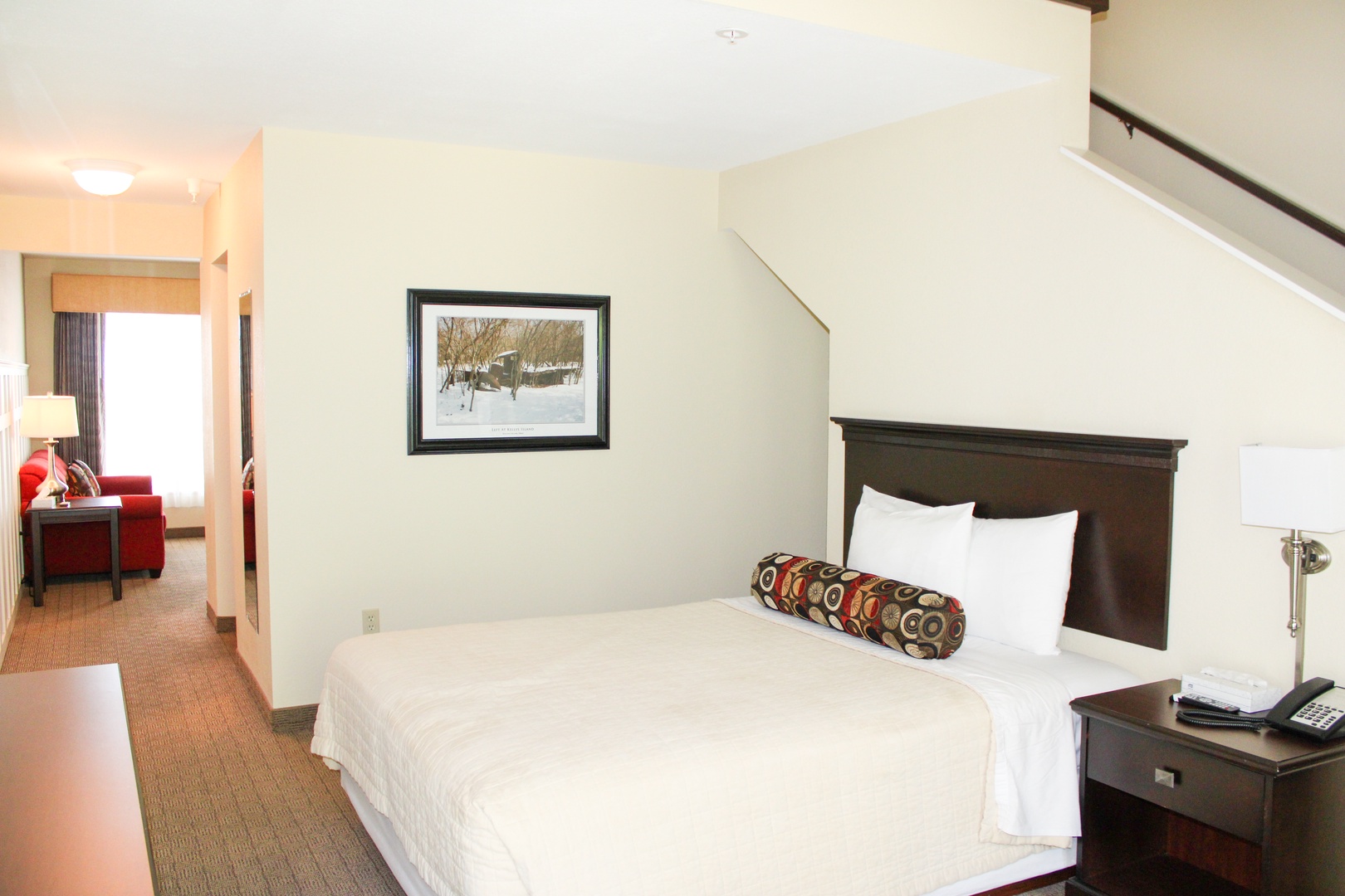 The Iroquois Suite is situated on the second floor of the hotel and has two levels. The first floor contains living and sleeping areas separated by the bathroom. The second or loft level has a spacious bedroom with two queen size beds and a cozy sitting area by the dormer window that overlooks the lake. Each of these units also has access to a common balcony. This unit can sleep up to six adults. The first floor has one queen bed, and the second floor has two queen sized beds side-by-side.