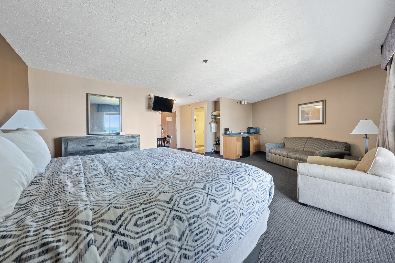 This guest room features one king-sized bed and one pull-out sleeper sofa. It accommodates up to four guests. All second and third floor rooms have a screened in balcony with seating, and first-floor rooms have open walk-out patios. Requests for specific floors, room numbers and locations are noted but are not guaranteed.