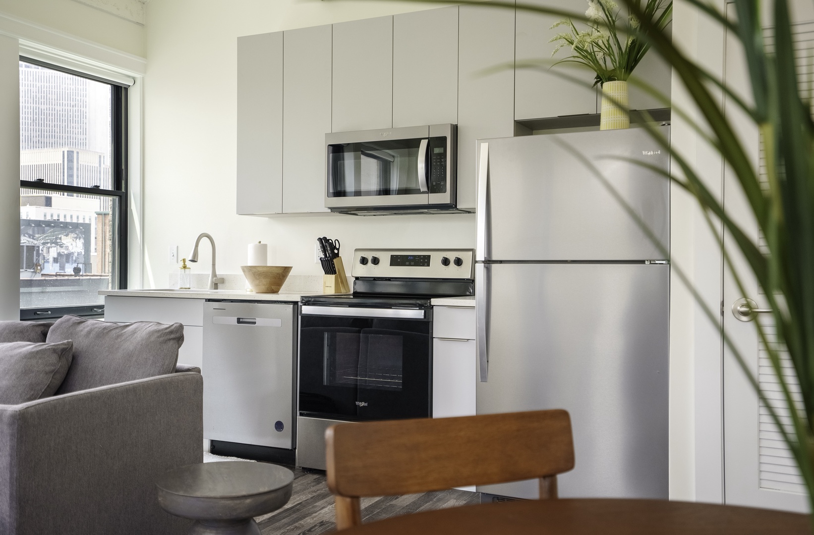 Relax in a thoughtfully designed living room, a Roku TV for streaming, and large windows that bring in natural light. It’s the perfect place to unwind after exploring the city.