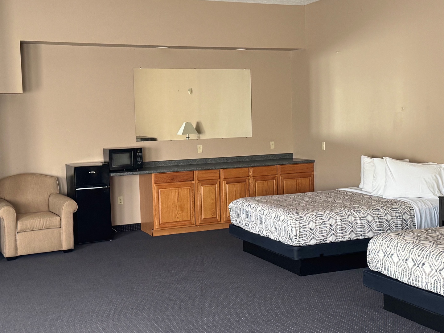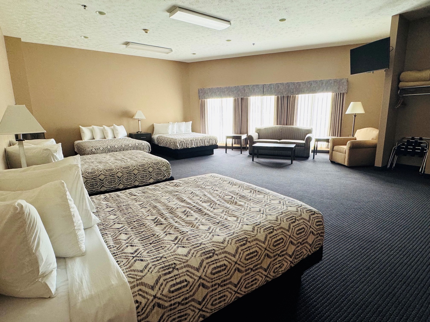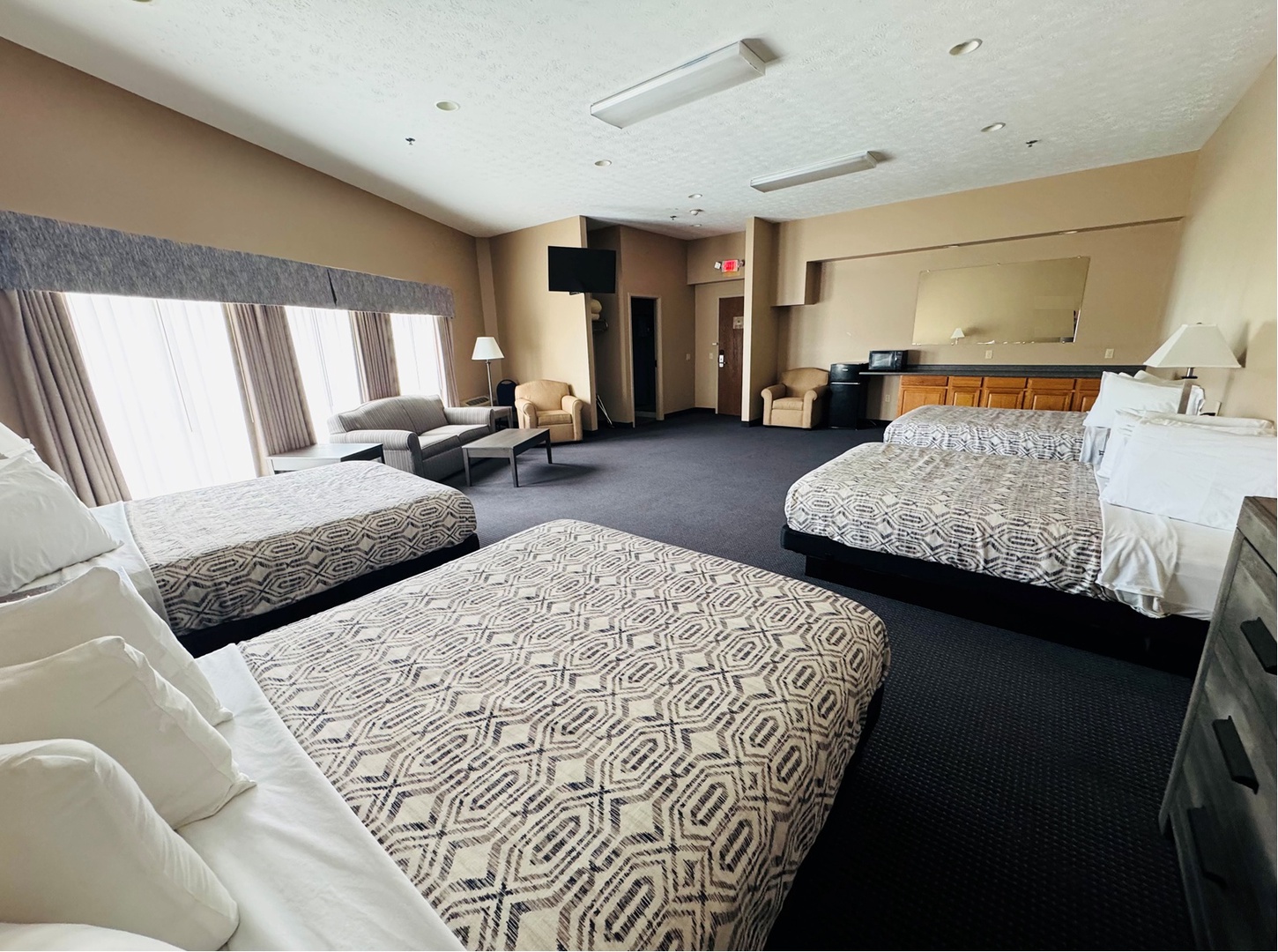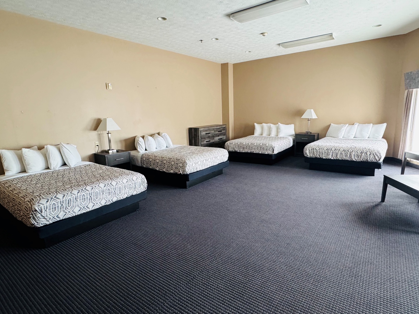 Our spacious ten-person suite features four plush queen beds and one pull out sleeper sofa. This room boasts a long countertop, perfect for prepping snacks, setting up a small buffet, or organizing a workspace. A mini refrigerator and microwave make it easy to store and reheat meals.