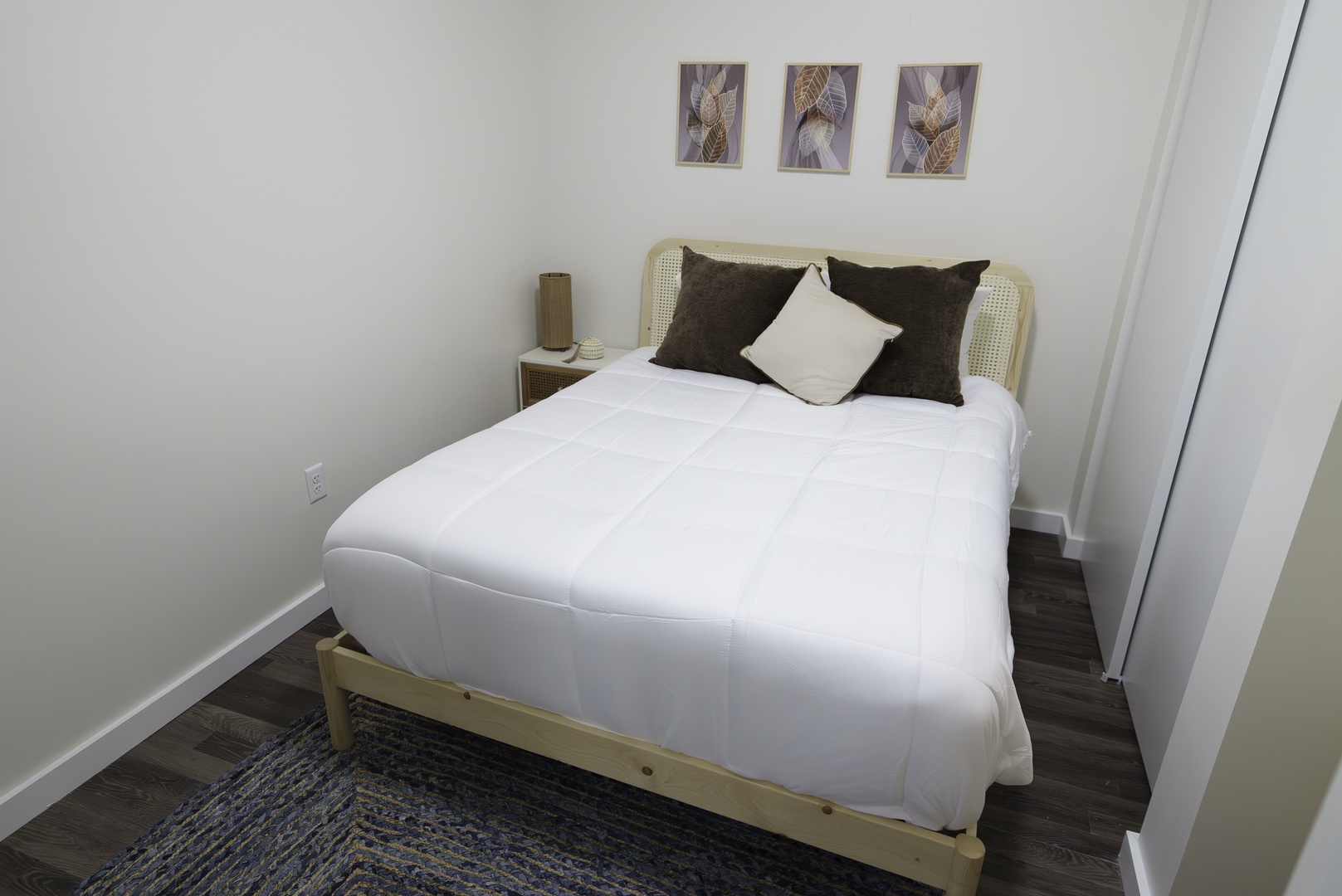 The bedroom is a made for comfort, furnished with a plush queen-sized bed and tasteful decor. After a day of adventures, sink into the soft linens and enjoy a peaceful night's sleep. The apartment also includes a clean and modern bathroom with a walk-in shower, providing a refreshing start to your day.